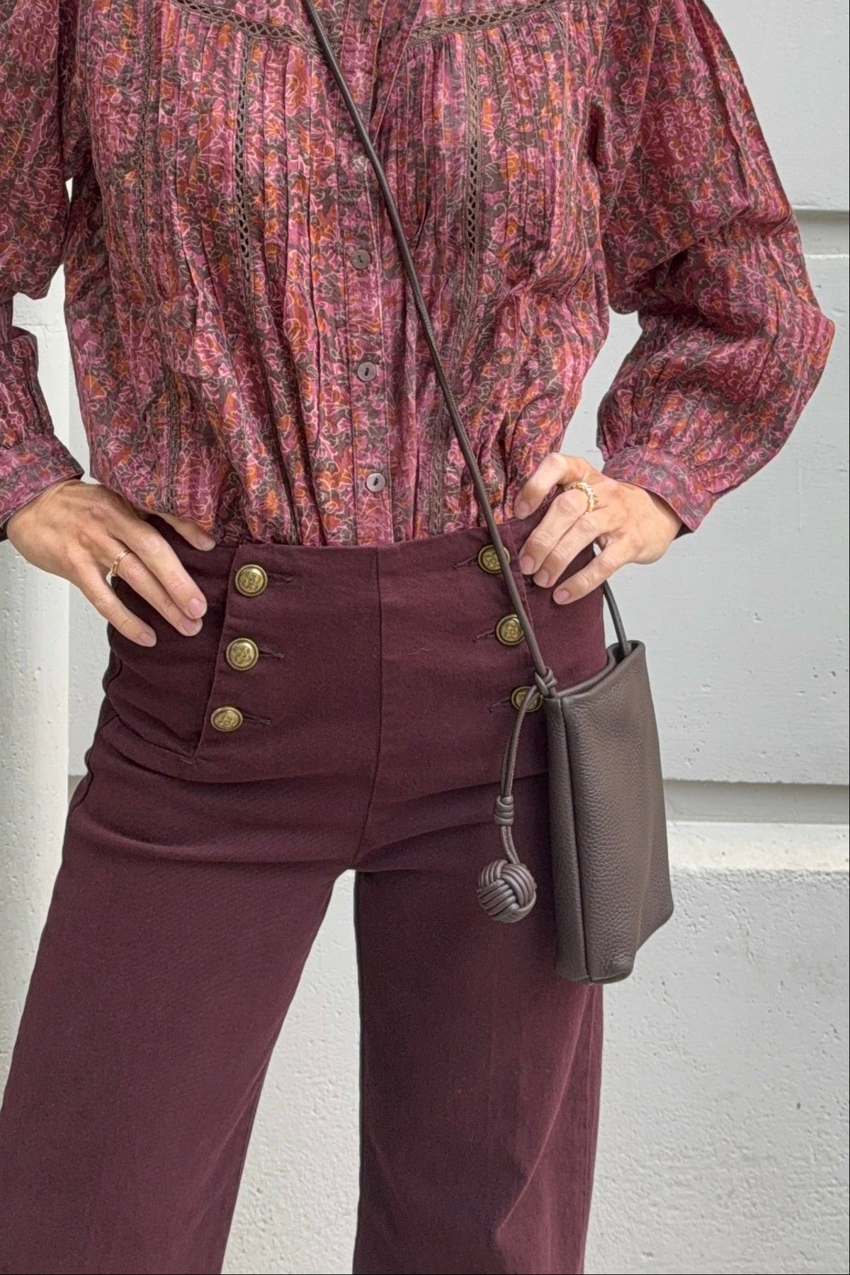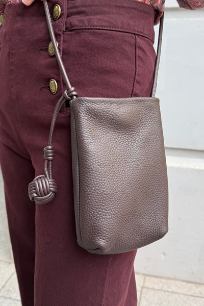 El Bolso Léa, pequeño de estilo sencillo, adornado con una delicada bola colgada del asa. El marrón, un color clásico y versátil, combina con cualquier vestuario.