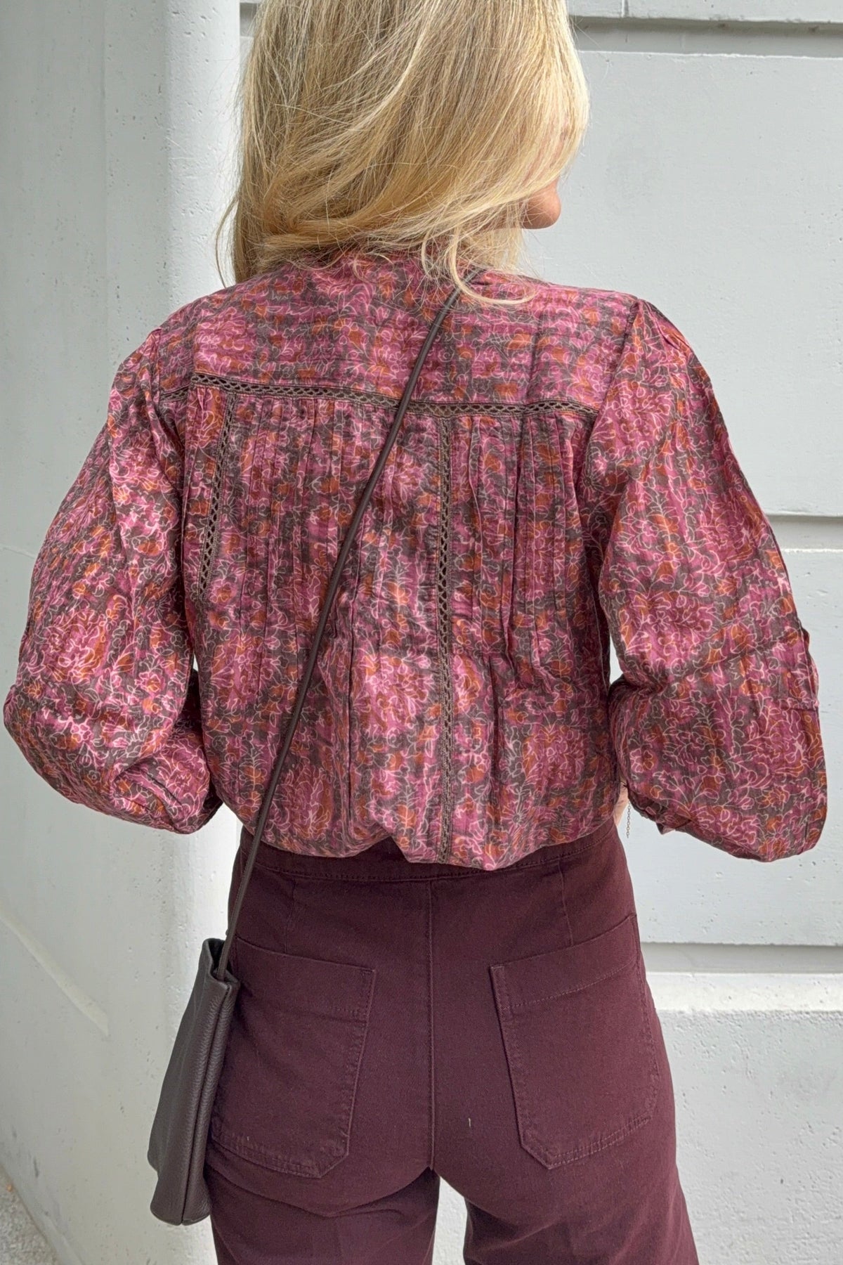 Un intrincado bordado en contraste traza el pecho, las mangas y la espalda, acentuado con ribetes y botones a presión que resaltan su carácter vaquero. El tono rojo le da presencia sin agobiar.