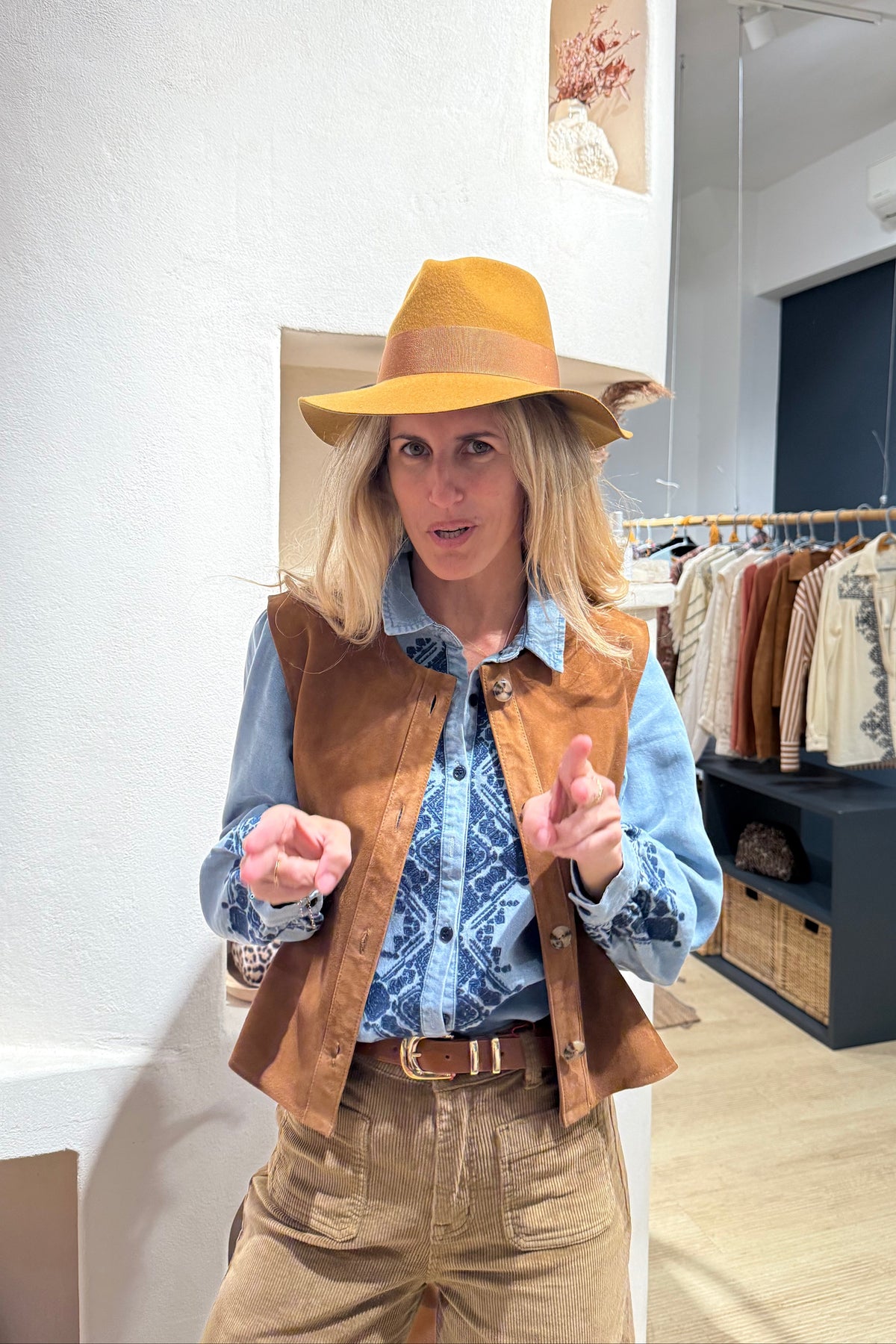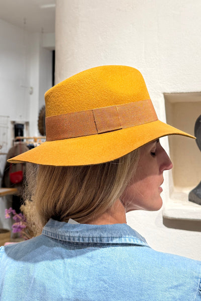 Sombrero Sergio en tonalidad camel, una pieza atemporal que combina elegancia clásica con versatilidad moderna.